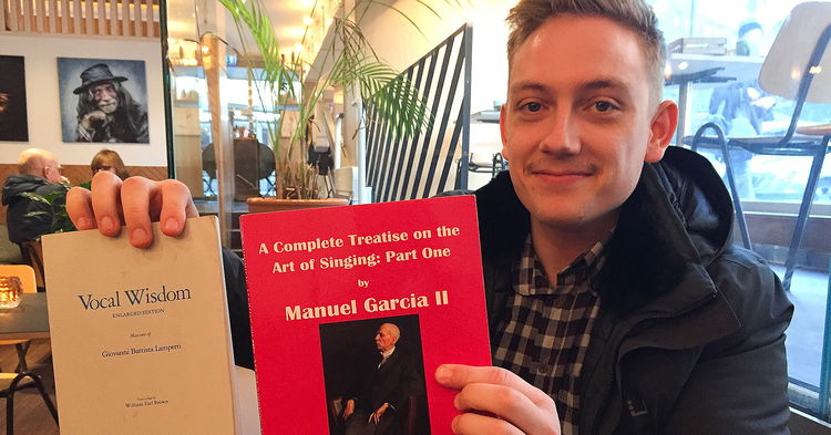 Bror Magnus viser ivrig fram understrekingar i to favorittbøker han alltid har med seg i veska: ei bok med gullkorn av Giovanni Battista Lamperti (1839−1910) og første bind av Manuel Garcia (1805−1906) sitt store songlæreverk.