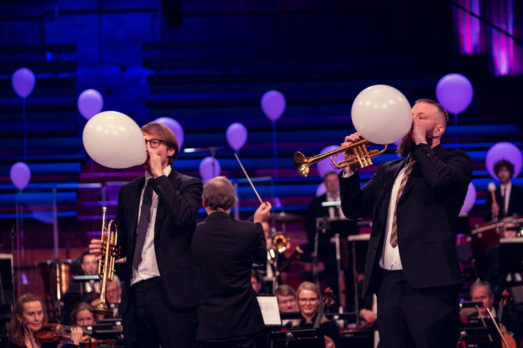 Trompetistene Brynjar og Axel puster inn en gass som er lettere enn luft. Det gjør at svingningene går fortere, og de klarer ikke å spille riktige toner.
